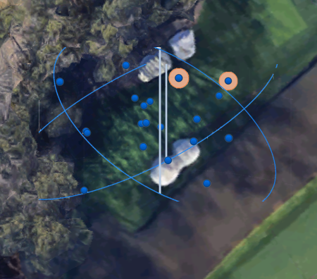 Here is the 8th and 9th green at Morgan Creek, our home. When you have a green that’s shaped for your dispersion, in general, play more to the middle of the green. On hole 8, for example, the solid pull will carry the bunker and the short right shot will be a putt or a simple chip up the green, for a right-handed golfer. On hole 9, for a right-handed golfer, you have to hit a SOLID shot. Short right is the water and long left is a tough, tough up and down. My suggestion: go at the middle of the green (distance wise) at the pin if you have a good number for a full swing. If not, play the ball to miss the green short left as you will have an easy chip.