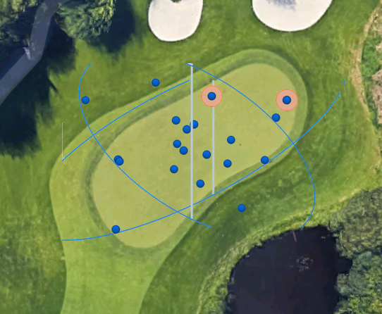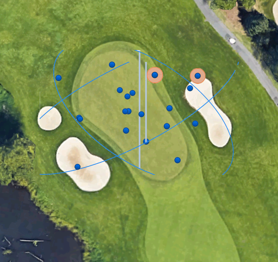 Let’s take the Sunday pin, for example. From the front edge of the green to the back edge at the hole, the green is approximately 11 yards deep. For those keeping score at home, you have 5.5 yards either way for distance. From that distance, it is difficult to hit a shot in that area with no pressure and no wind!